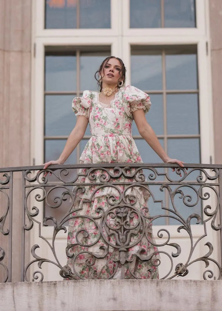 The Adeline Dress is a romantic dream brought to life with cascading tiers of floral fabric and delicate lace trim. Its puffed sleeves and vintage-inspired print create a whimsical charm, while the full, layered skirt offers graceful movement. Perfect for garden soirées or elegant celebrations, this dress is a true statement of timeless beauty.